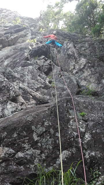2P目は一段登ったところの大岩を抱くように回り込み、手足が少ないところをずり上がる。10mで終了点。あまりにも短いので5m上まで無理やり登って終了とする。