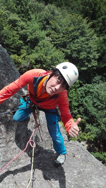 トラバースまでの道のりは左右どちらでも行けそうで迷う。右上した。トラバースの段は上段か下段か迷う。上段を使った。トラバースを越えてピッチを切る。ここからは最後の5mのクラックライン。終了点に乗り越すところが核心のⅤ。右半身になり、足とお尻でスメアリング気味に体を上げて上のガバを取る。