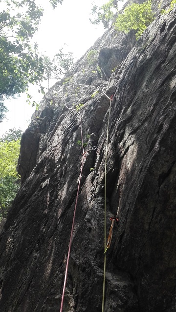 保岡さんを拾って中央道を八王子ICで降り、2時間30分で千足に到着した。ここから1時間のアプローチ。樹林帯は日差しが遮られ、時折涼しい風が吹き抜ける。しかし、気温と湿度が高く、大汗をかいた。8時30分から登り始め、天狗滝、綾滝を通過し、9時30分には岩場に到着。水を飲んだりハーネスを着けたりして10時から登り始め、15時に終了。