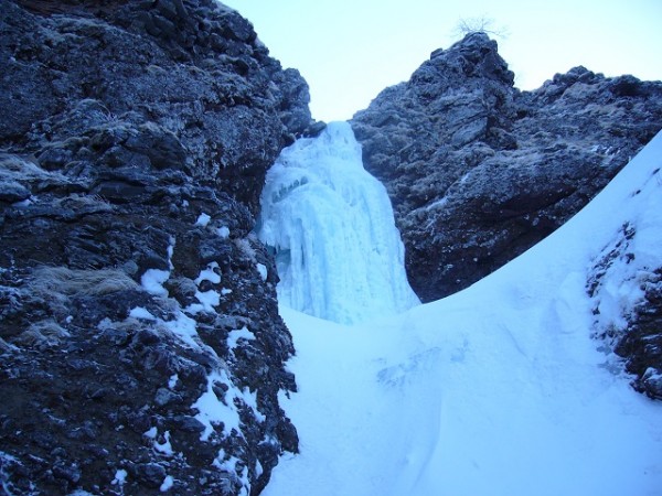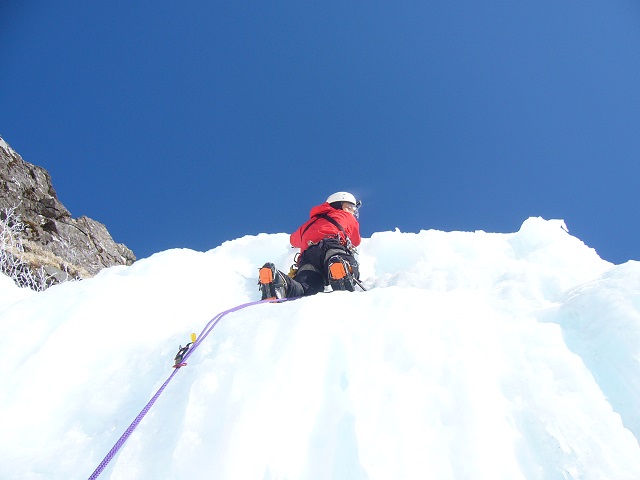 氷が硬くて脆く、アックスとアイゼンが刺さりません。氷の内部に空洞が点在していて、アイススクリューの効きに不安を感じます。  1回登ったところで、先を急ぎます。懸垂下降してナイアガラの滝基部に戻り、本谷へトラバースしていきます。 30 大滝