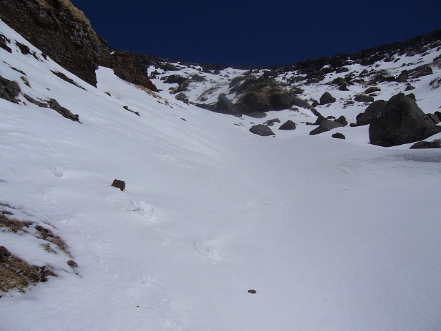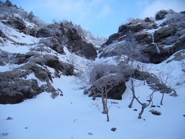 大滝の落ち口の様子です。ここから左の尾根に沿って谷を詰めていきます。稜線近くまで来たら尾根に乗り、硫黄岳山頂に直接登り詰めます。 33 硫黄岳山頂