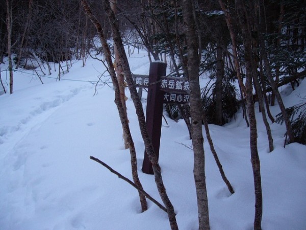 赤岳鉱泉の様子です。赤岳と阿弥陀岳が顔を覗かせています。21日に営業終了したアイスキャンディーでは、数人のクライマーが登っています。  26日早朝、予定よりも30分ほど早く出発します。夜の間に降雪があったようで、赤岳鉱泉周辺で新雪が5mmほど積もっています。 07 大同心沢
