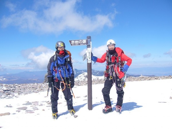 山頂で記念撮影です。 【行程】 1日目 小淵沢駅(11:10)=赤岳山荘(12:00)~赤岳鉱泉(14:30) 2日目 赤岳鉱泉(5:30)~ジョウゴ沢(5:45)~F1、F2、F3~ナイアガラの滝(7:10)~トラバース~大滝(9:30)~硫黄岳(12:10)~赤岳鉱泉(14:00)~赤岳山荘(17:10) 【感想】 ■木村  硫黄岳山頂まで、登山者に出会うことは無く、ジョウゴ沢は貸切状態でした。終日好天に恵まれ、楽しい山行となりました。  暖冬の上に、3月下旬のジョウゴ沢ということで、F1、F2を登ることが出来なかったのが、少々心残りとなりました。  今回遡行したルートの核心部は詰めでした。山頂にダイレクトに突き上げたかったので、結果的にトレースが無い方向にルートを取りましたが、体力を大きく消耗しました。それだけに、晴天の下、山頂に出た時の喜びは格別でした。 ■二見  シーズン後半、平日が重なって一組のパーティーとも遭遇せず、独占状態のクライミングでした。無風晴天にも恵まれて絶好の登山日和、沢を背にすると阿弥陀岳の素晴らしい姿。標高を上げていくと赤岳、中岳そして横岳の大迫力が迫ってくる。 16 阿弥陀岳