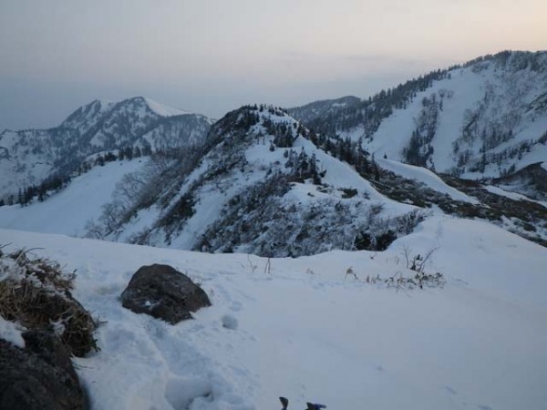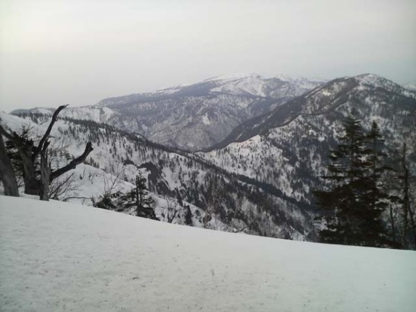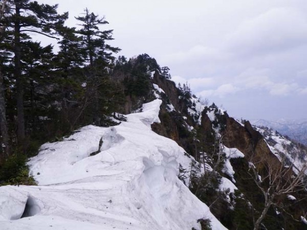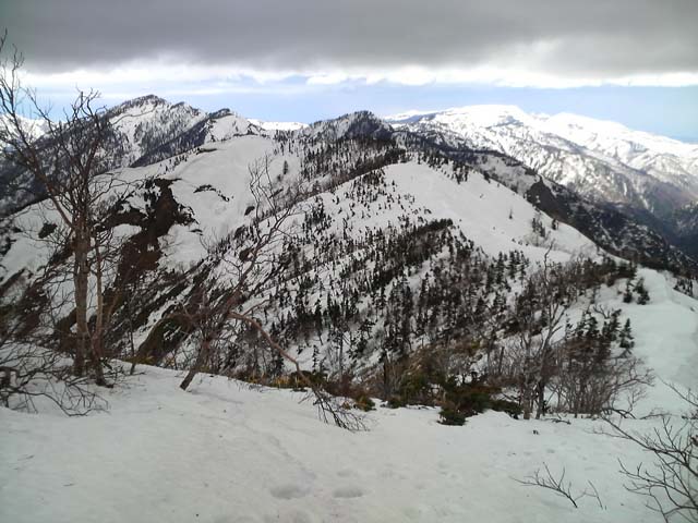 さて気持ちの良い稜線をしばらく行くと、標高にして1,750mの稜線上から一気に150m程高度を落とす急な斜面が出てくる箇所がある。実はこの箇所、前回の山行でスリップし、滑落停止の動作を取った際に右肩を脱臼したという苦い経験がある場所なのだ〔この時は三坂峠から三国スキー場(現在は閉鎖)へ、この時期リスキーな沢筋を辿りエスケープした〕。この失態は雪質を甘く見ていた自分の油断にある。何時でもどこでも油断大敵だ。その後約1年に亘り岩登り・沢登りなどで亜脱臼を繰り返すようになり、最終的に手術で治すことに決めた…。当時の記憶が蘇る中、脱臼の手術に至らせたこの斜面に対しうらめしく、また懐かしくもあった。
