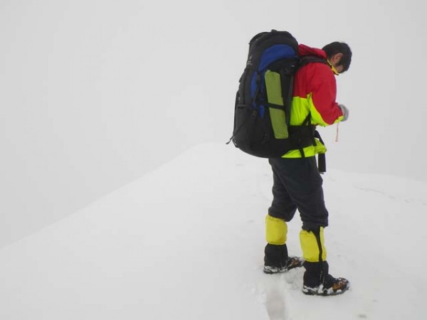 ところどころに氷と岩、そして雪稜とのミックスで気は抜けない。ただ微妙ではあるがアイゼンがほしい程ではなかった。パーティー構成によっては装着を指示すべき所だ。沖ノ西沢ノ頭を過ぎ、白砂山が眼前に迫ってくる。稜線がクランク状にくねるあたりでは風が特に強くなり、身体が持ってゆかれそうだ。この辺りから上越国境稜線となるので風の通り道なのだろう。その中、二人組の女性パーティーとすれ違った。彼女らは三国峠から入り、本日が三日目だそうだ。つまりは行程が我々のほぼ逆コースらしいので、おそらく山の嗜好が似ているのだろうと考えてみたりする。