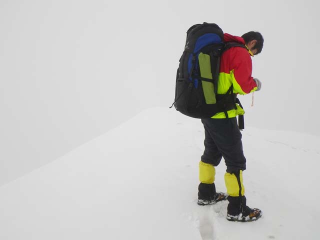 予定よりわずかに遅れ気味のため、早朝5時出発厳守とした。雨は止んでいたが少々風が強い。事前のリサーチでは本日の行程に1ヶ所痩せた稜線の通過があるらしいが、どうやら赤土居山を越えたあたりがその箇所のようだった。