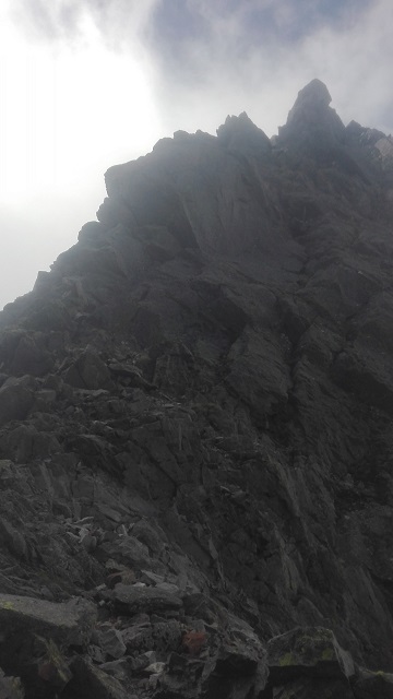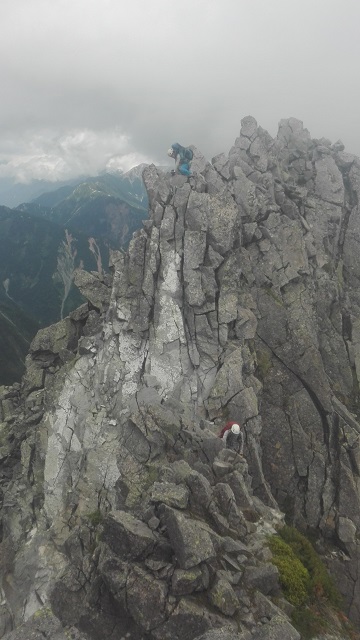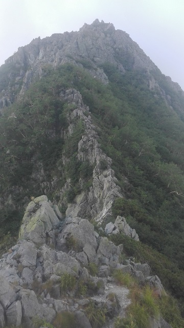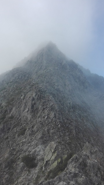 核心の3峰。幸運なことに5、4峰ではガスっていた空が晴れている。ここはガンガン行くしかないのでロープアップした。軽量化のために50mシングルと20m補助ロープしか持ってきていない。
