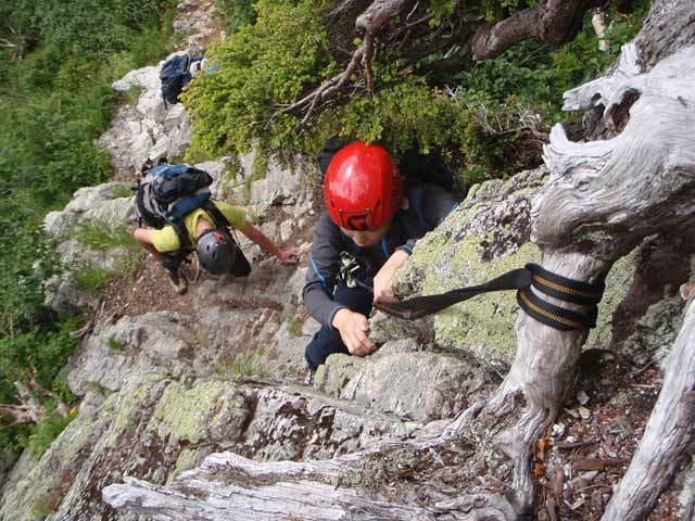 次の岩場は難しくはないのだが、空中に身を晒すので万一踏み外したらそのまま谷に転がり落ちそう。自分が上がったところで木の根からスリングを下ろし、後続はそれをハーネスに連結して上がってきた(8:50)。