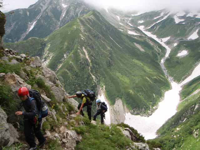 取付きが空いたので登り始める(5:40)が、すぐに最初の関門でつかえる。胸より高い岩に残置スリングがあるが、そこを上がるのが難しいようだ。3、4パーティが溜まっており、ロープを出す隊もあってなかなか進まない。雪渓を眺めていてもこちらに上がってくるものはなく、自分たちが今日の殿(しんがり)らしい。