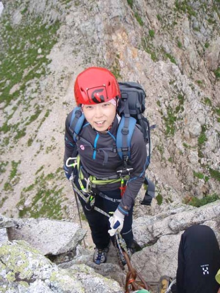 次の少し大きな岩の斜面も怖がりさえしなければ難しくない。途中にハーケンがひとつ、岩の上にも残置スリングがあったので、ロープを出して確保する場合もあるのだろう。雨で岩が濡れている場合などはそうした方がよさそうだ(9:15)。