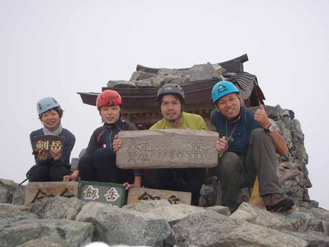 いい加減草臥れてガレ場を登っていくと足元に古い空き缶が落ちており、目を上げるとお社の屋根が見えた。剱岳初体験の3人を先に立て、15:40に登頂。この時間ではガスが湧いて周囲は見えず、人もいない。休憩するうち雨模様になってきた。