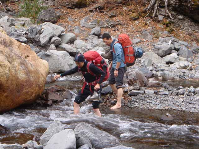 ここは比較的水量が少ないが、やはり靴を脱ぐしかない。各人が先の渡渉で転倒防止用に拾った即席の杖を手に渡る。