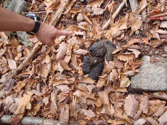 鋸岳へは最初のうち樹林の中の緩やかな登り。道の傍らの大きな糞はおそらくクマだろう。1480m付近には「大岩小屋へ」「横岳峠へ」とプレートがあり、昭文社地図にはない道の分岐を示している。