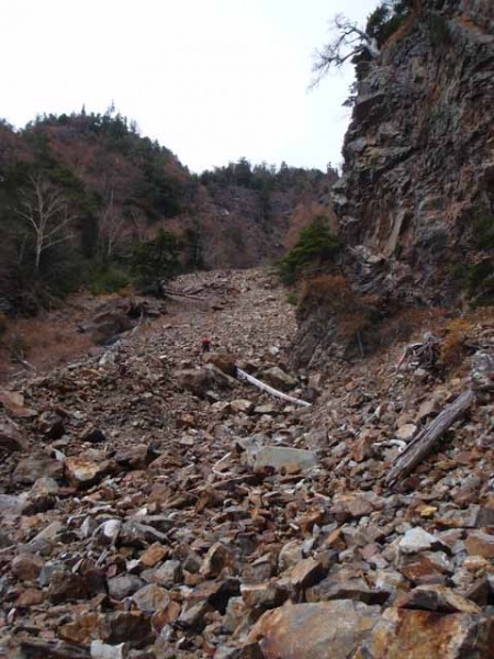 廃屋となっている丹渓山荘を見上げて戸台川沿いの道を辿る。再び河原に出て赤テープに従って右岸(北側、今回の登路側)に渡り20分ほど進むと崩壊地で行き詰まった。水に入らずに左岸に戻れる箇所を探すが結局ほとんど元の地点に戻って再渡渉。左岸では河原や樹林に赤テープが続いており、10:30に<鋸岳 角兵衛沢>の案内板に到着。