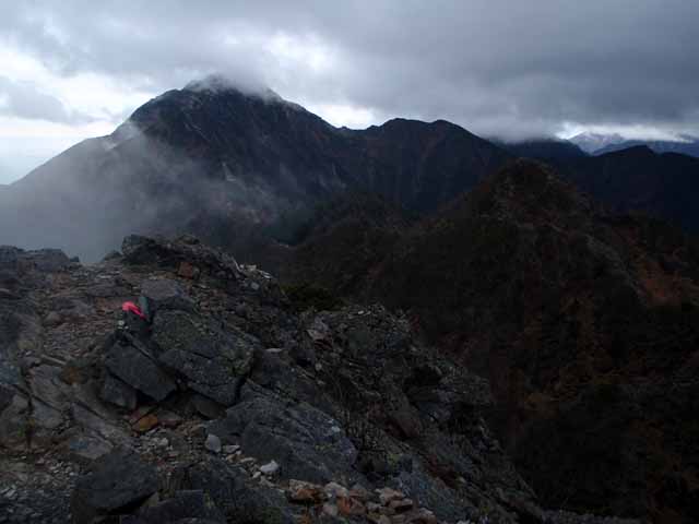 角兵衛沢ノ頭と鋸岳の間の稜線に出て荷物をデポし、急傾斜を攀じ登って第一高点(2685m)に到着。すでに15時近く、頭上にのしかかる雲で薄暗い。甲斐駒方面はアップダウンが続き、たとえ水があっても今から突っ込むのは厳しそうだ。