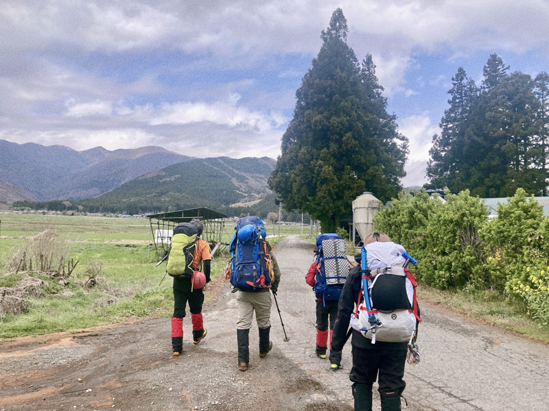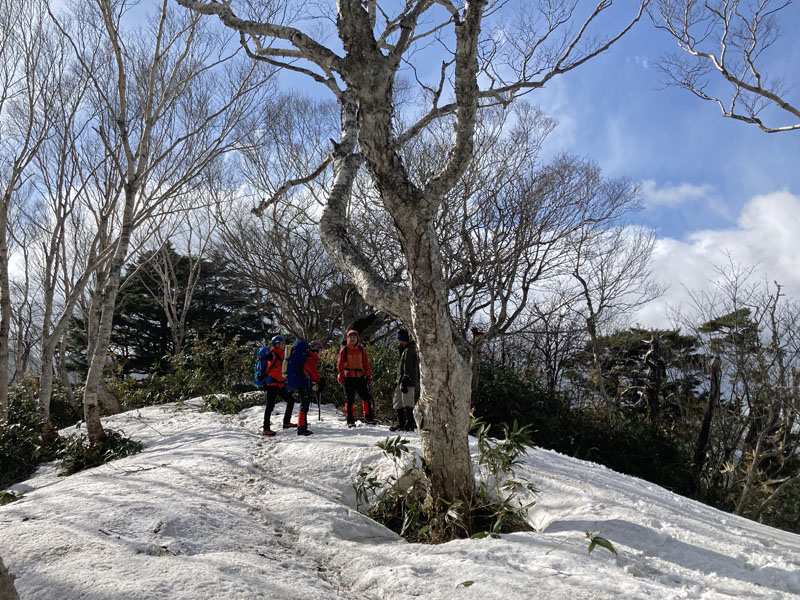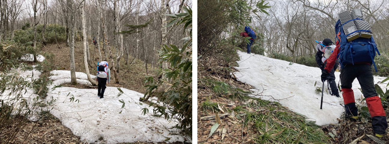 さて下山時には、夏道から外れたルートを探索してみる。普段ならば藪が濃く通れないところも、積雪により楽に通過が可能だ。テン場に帰還し、撤収して下山を開始した。昨晩からの降雪により、かなり下のほうまで雪がついていて昨日と同じ道に思えない。天候もよくなり春の暖かい日差しに照らされ、いよいよ残雪期らしい山歩きを楽しみながら高度を下げていった。
