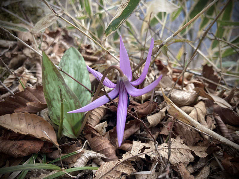 雪が...無い! 長いことただの夏道が続く。水が作れるだろうかと心配が募る。百村山(もむらやま)から先、ピークごとに標高差100~150m程度の急登があり、落ち葉の溜まった泥道を登るたびに、奥地の大佐飛山がますます遠く感じられる。しかし、途中にカタクリの群生地があり、薄紫の花を見かけると少しは癒やされる気がした。