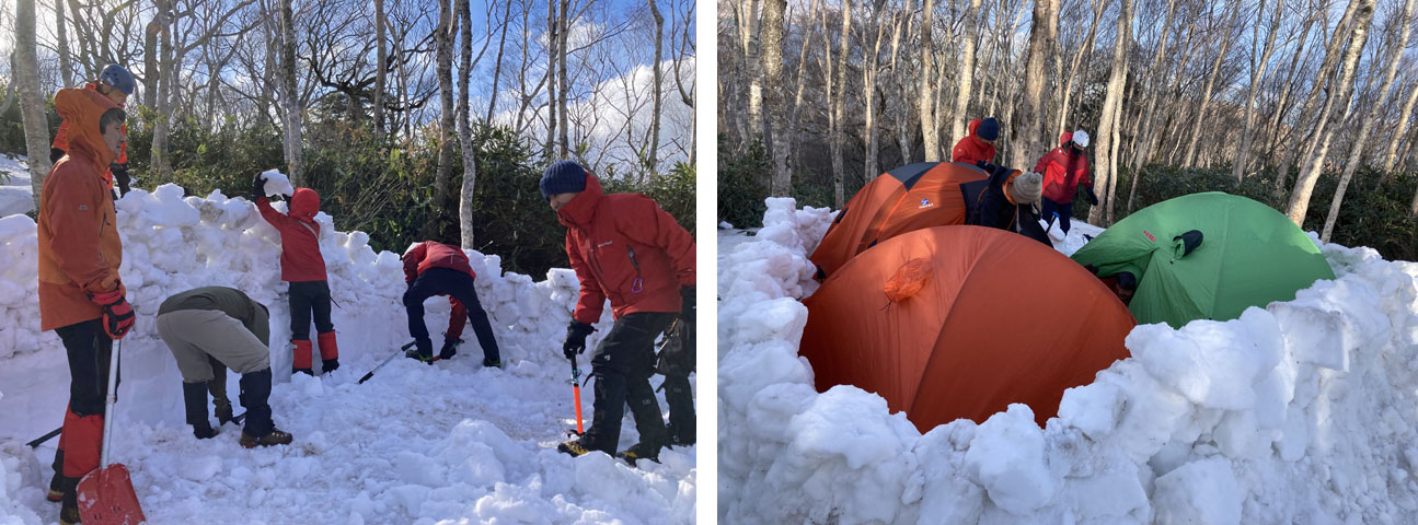 雪上テント泊設営方法、防寒対策や準備品など学ぶことが多い山行だった。