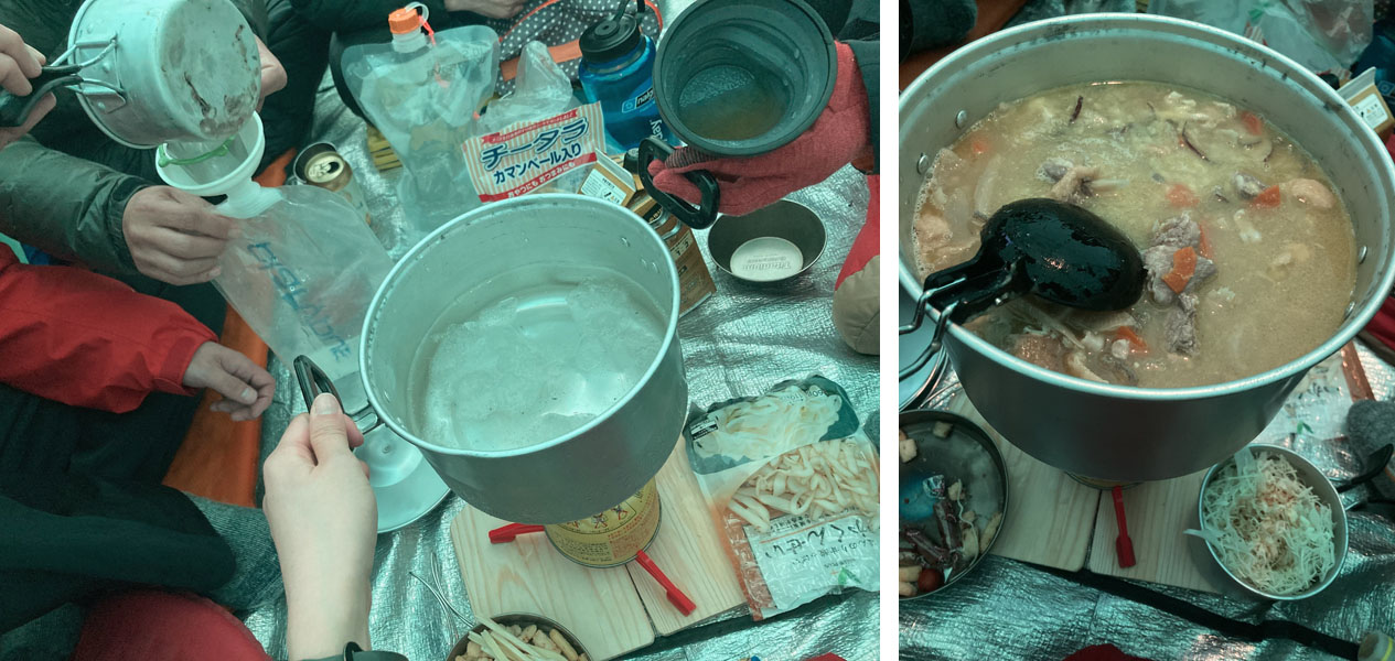 今回の合宿から共同炊事が再開となり、夕食(豚汁ペミカン)を担当した。なかば訓練も兼ねて水などの液体を多めに背負った。初日に21kgのザックで6時間登れたことはひとつの自信となった。人数が多いときに、引き返す計画やアイゼンの装脱着のタイミングを決めるのは難しいと思うが経験を積んでいきたい。