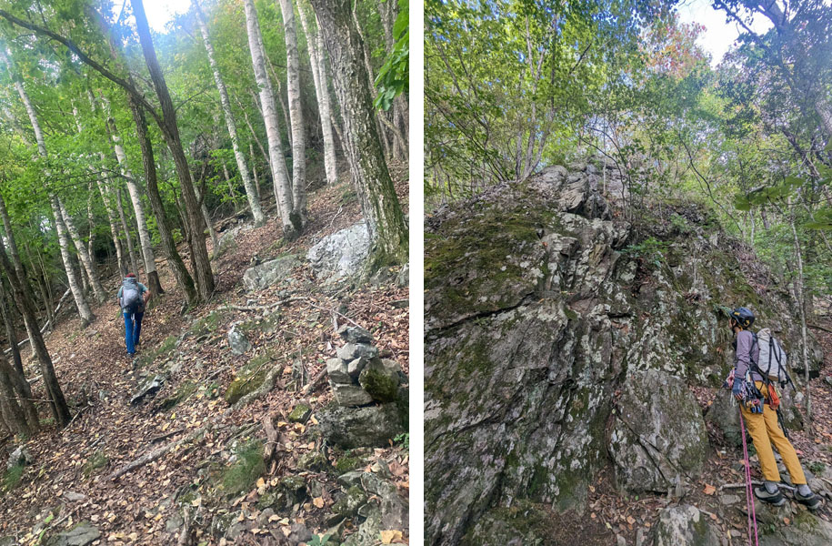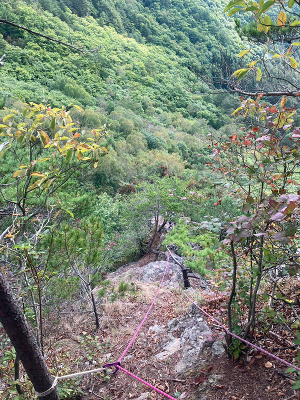 左側のロープをくぐるとかなり急な下りとなるが、踏み跡は明瞭である。標高差で150m下りるとトラバースとなり、急に踏み跡が薄くなる。ところどころにあるケルンを目印に進むと、難なく取付きに着く。