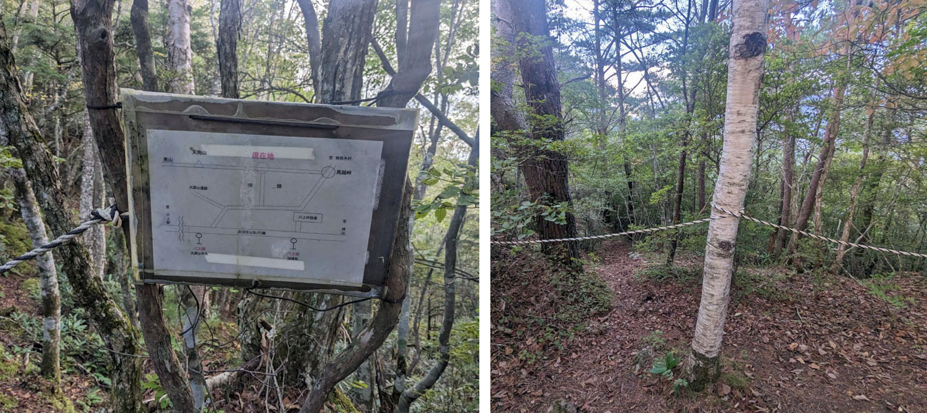 天狗山登山口からの一般道を標高差で100mほど登ると、右側に標識、左側にロープが張られた場所に着く。ここが、目指す尾根取付きへの分岐となる。