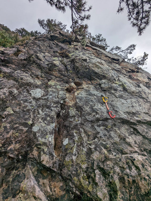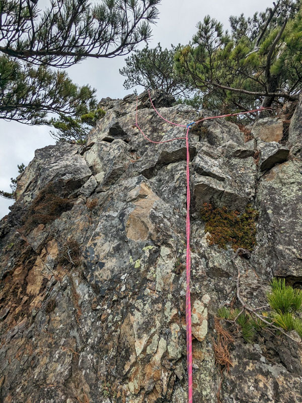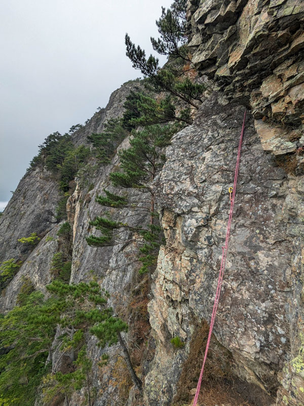 下がすっぱり切れ落ちたスラブにペツルが打ってあるが、背伸びしても届かず、乏しいスタンスになんとか右足を乗せてヌンチャクをプリセット。右側ハング下にガバあり。足も置けるが脆い。中間部から右上する。上部は浮き石が多い。上がってすぐの松の木でビレイ。屈曲してロープが重かった。
