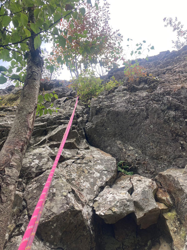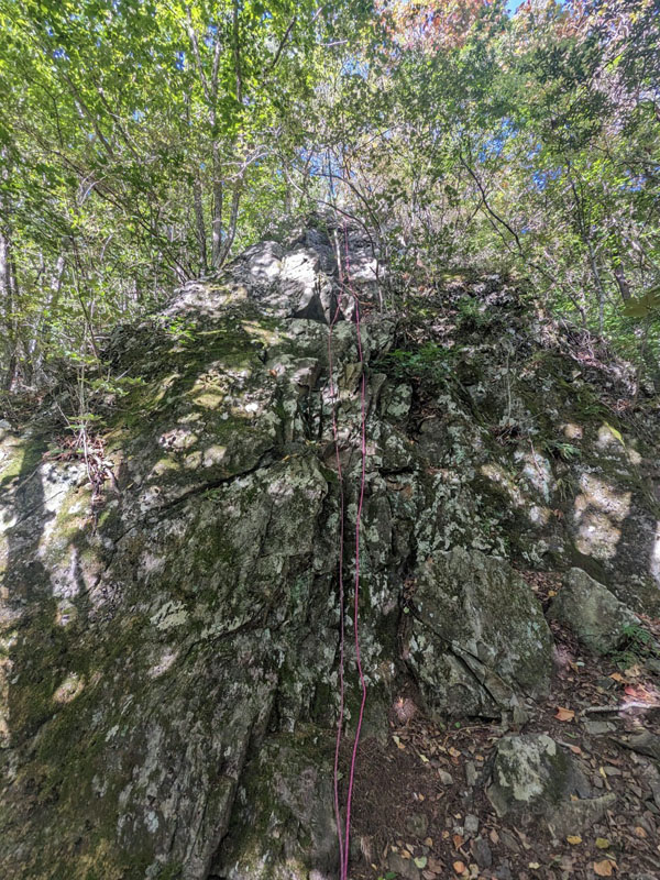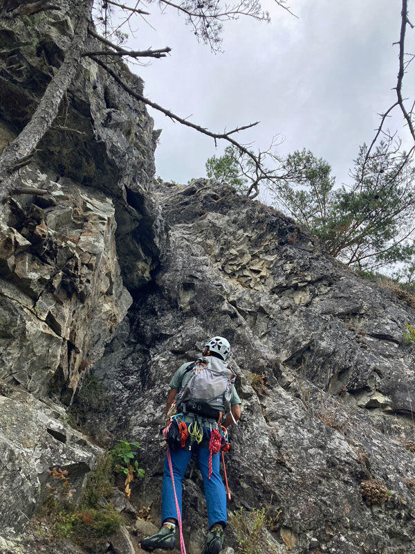 右ステップから真ん中を登る。土や苔の付く階段状の岩稜。途中にテラス2箇所あり。ランナー無しでも行けるが、今はウォーミングアップとして2箇所、細木に取る。上部の松木でビレイ。