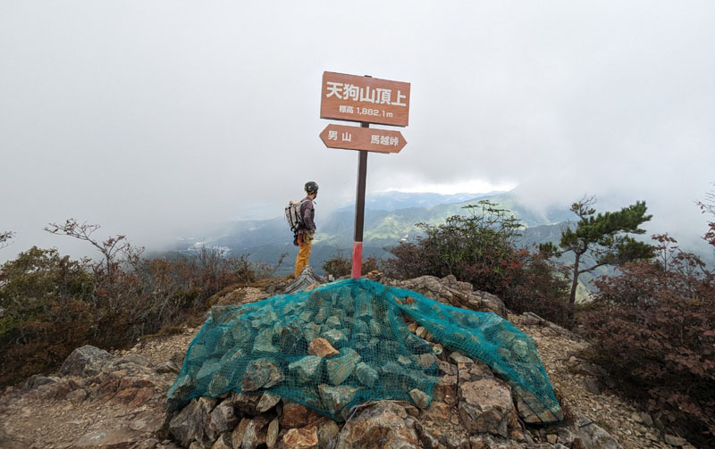 ロープを収納し、リッジから少し下りた樹林帯を歩く。11Pと12Pの切れ目も分からないまま、あっさり天狗山山頂へ。