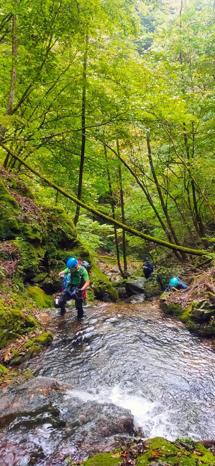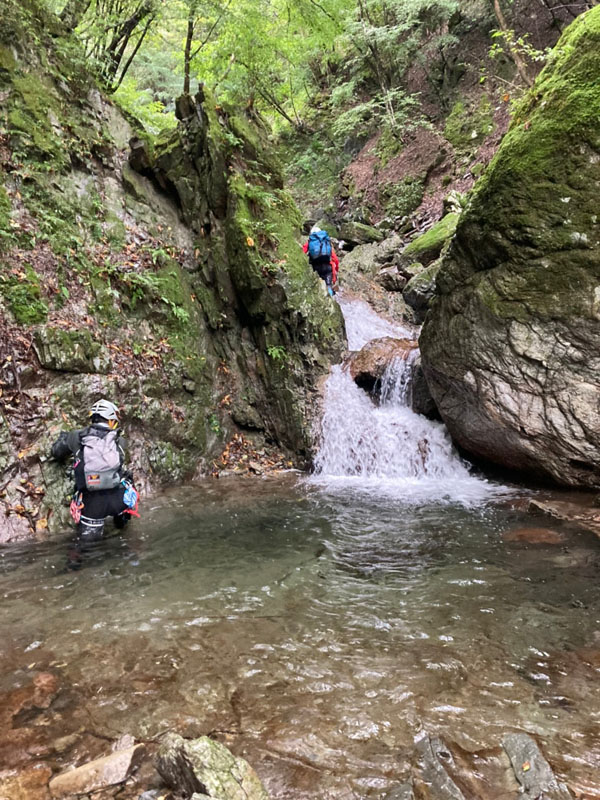 1~2m程度の小滝がテンポよく続き楽しいが倒木が集中する箇所もある。緑映える滝上の釜