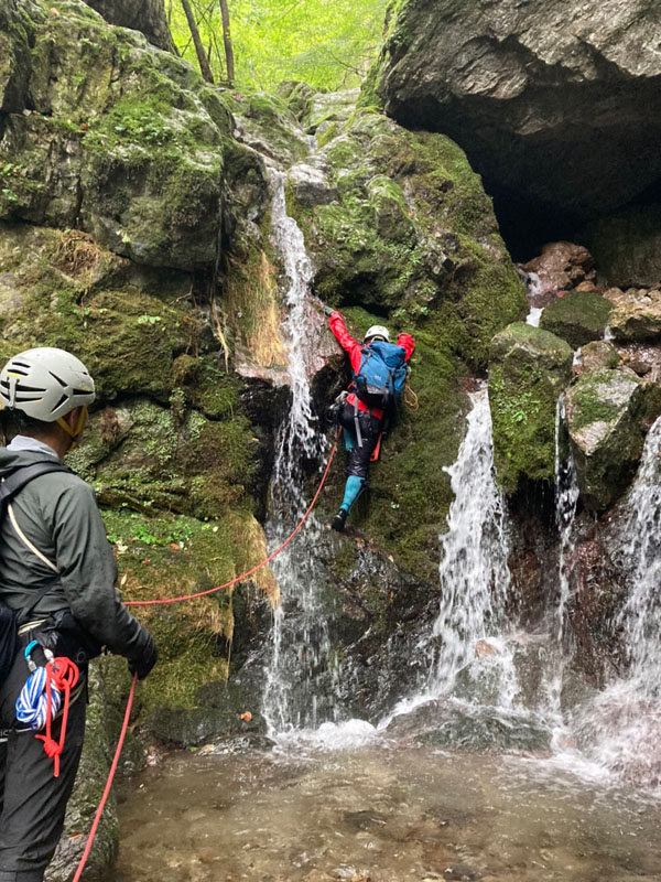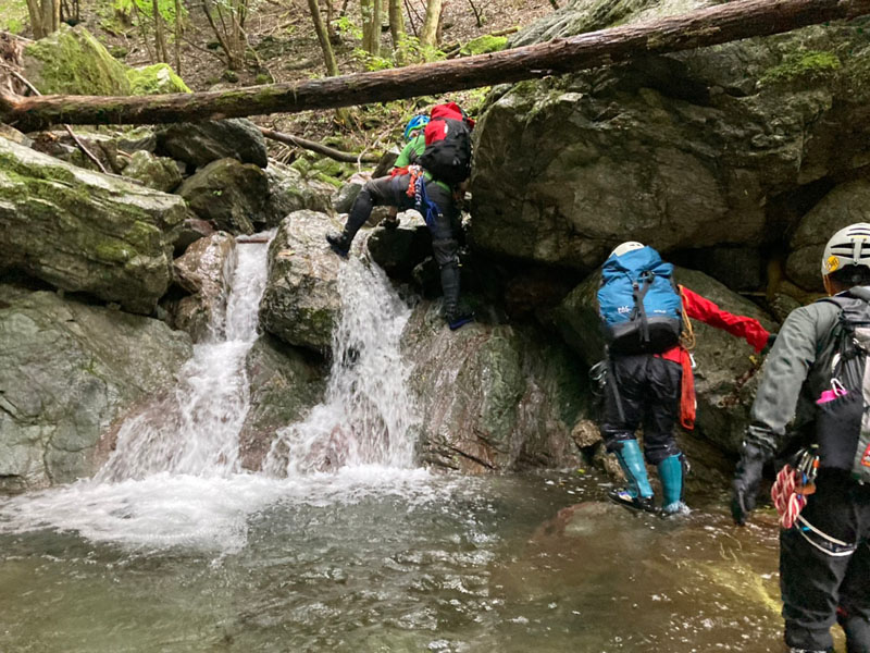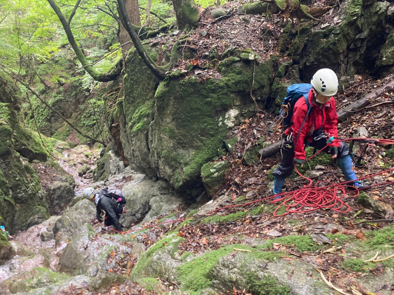 水流に打たれながら苔むした滝の中にホールドを探して登る。登り切ったところの立木にセルフビレイ。滝の音で上下の合図が全く聞こえない。身振りで後続の登攀開始を伝え、アンザイレンで登る。CS滝 駿谷登攀