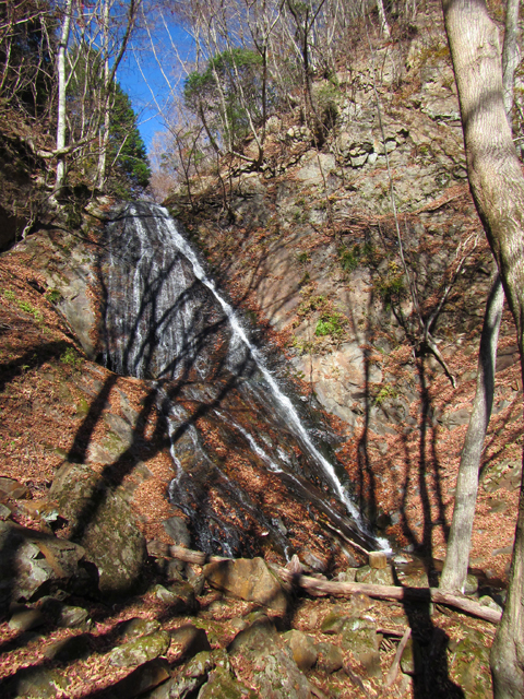 木橋で何度も沢を跨いで行くと20分ほどで法印の滝。水量はないが、白い糸が滑り下りるような美しい滝だ。