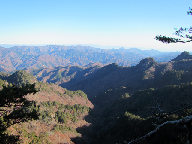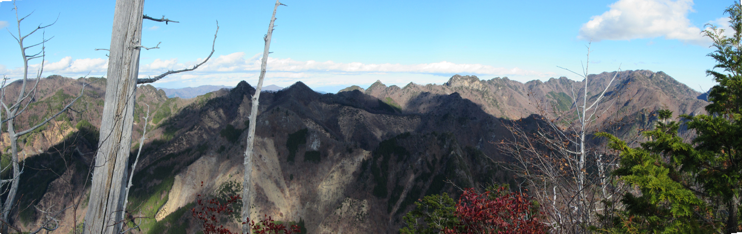 さらに20分少しの尾根取付点で前回下ってきた沢コースから分かれ、左岸の斜面に入る。ここからジグザグに一気に高度を上げて山頂西の稜線に突き上げ、岩稜を伝って南天山(1483m)登頂。眺望絶佳、明日歩く県境の山々から両神山にかけて眺められた。