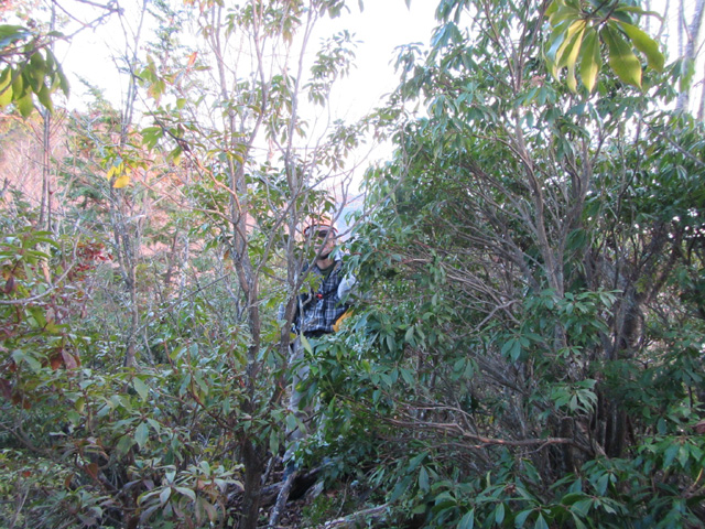 p1538西の1550m小ピークを踏み、次のp1562の東側が前回下山時にトラバースのヤブ漕ぎから脱した地点だ。今回はヤブに入り込まないように右(北)寄りに行くよう意識したところ、特に迷うこともなく尾根上を進めた。樹木が邪魔な箇所もあるが、そのまま次の1550m小ピーク(前回はここを回り込む形でヤブに突入した)を過ぎる。