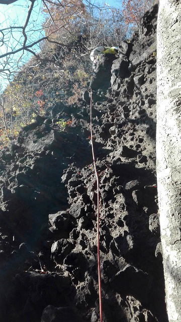 岩壁は溶岩質で石が固まった感じで、ガッチリしていると思っても触るとポロッと外れる脆い石が混ざっており、一見ではわからない。油断できないので踏むときも掴むときも用心しないといけない。また、岩壁の途中に木と土のエリアがあり、ずるずる滑って始末に悪い。P7はそんなルートで時間がかかってしまった。