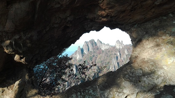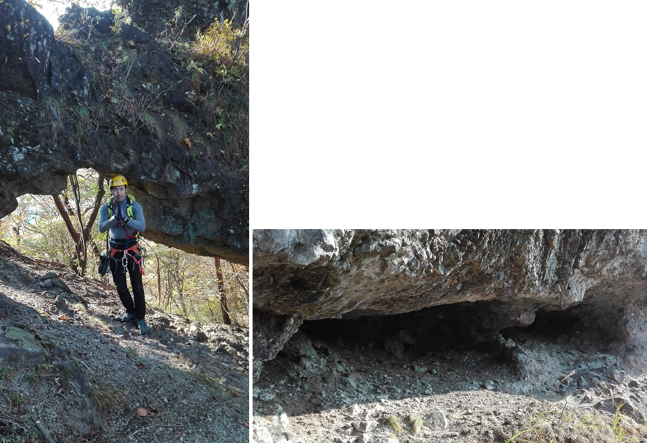 このトラバースはカニのハサミを巻くもので手前に仙人窟が突然出てくる。東側から穴をくぐると岩壁に大きなくぼみができており、風穴の方ではなく、こちらが本当の仙人窟であろう。