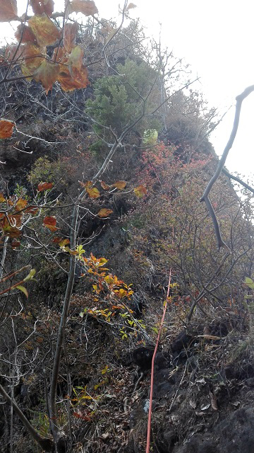P12(つづみ岩)は西を大きく巻くこともできるがここは直登にした。途中に厳しい箇所があり、ロープウェイ方式で二番手三番手を上げた。20mくらいの壁で、前半は草付き、その後外傾した大岩の乗越が核心であり、古いスリングと新しい鎖がぶら下がっていた。大岩を越えればすぐにP12のピークだ。P12の山頂は北に延びており、この脆く痩せた尾根の下降も侮れない。ピークから距離にして70mほどか、行き詰まってあたりを見渡すと東側の立木に懸垂用の残置スリングが1本だけ掛かっていた。そこを下降点とするが、心許ないので1本付け足した。懸垂10mくらいで傾斜が緩むのでここを南にトラバースしていくのがルートであったが、我々はもう一段降りてしまい、登り返すこととなった。