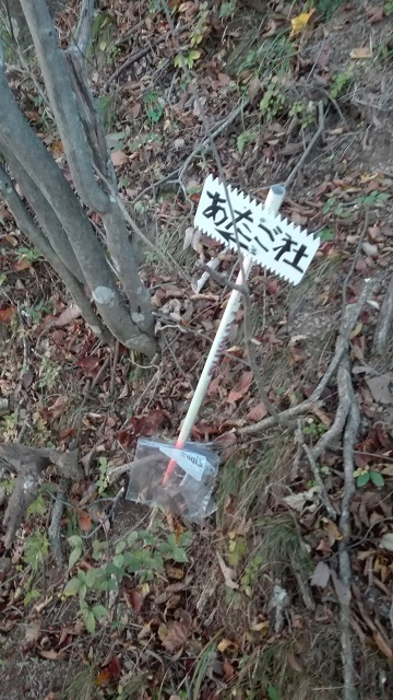 11/2深夜、宇田川さんにメンバーをピックアップしてもらい、関越道を北上、上信越道松井田妙義ICから一般道で妙義湖の畔へ。一旦中木ダムまで行ってから取付きを探す。ダムから2本目の沢を越えた突端の尾根から取り付けそうだ。手前のスペースに駐車して出発。10分くらいで「あたご社」の標識がある。