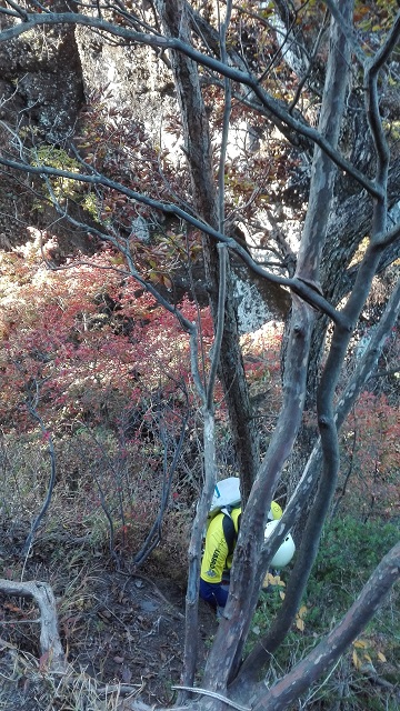 ⑪P12よりクライムダウンを交え70mほどで尾根が途切れるので、東側の立木を利用して約10m懸垂下降。
