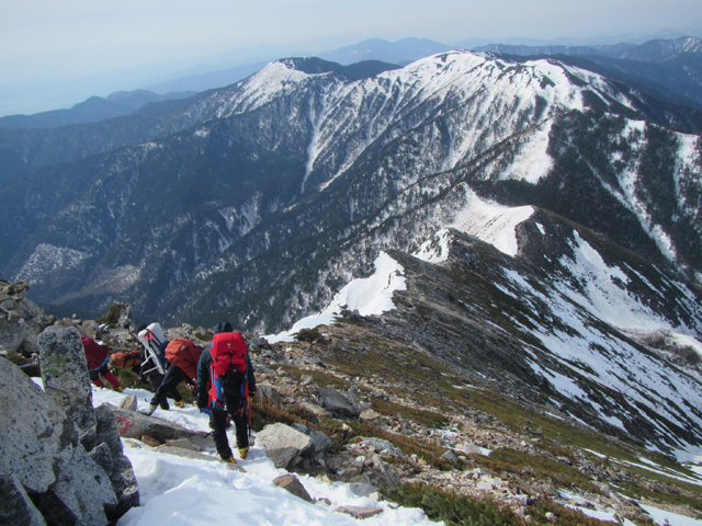 3時に起床。食事を済ませ、強風の中テントを一つずつ撤収。天候は曇り、変わらぬ強風を衝いて5時半前に出発。雪はほとんどなく凍結もわずかなためアイゼンは装着しない。山頂までわずかな距離であるが強風のため予想外に時間を費やし、常念岳(2857m)に7:40登頂。