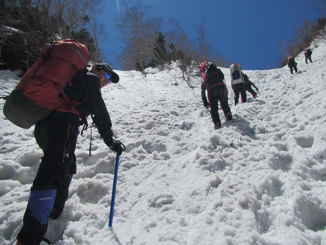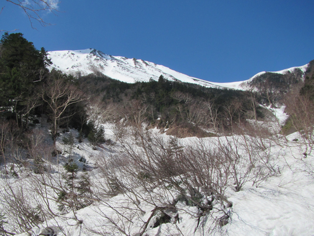 ヒエ平(1320m)では何人もが身支度していた。我々も装備を整え、7:40、いざ出発。雪は多少あるが凍結はなく、アイゼンは装着しない。一ノ沢に沿い残雪を踏みながら林間を緩やかに登る。出発時に薄く掛かっていたガスはやがて取れ、雪も思いの外しっかりしていて歩きやすく、心地よい。9時過ぎに大滝(1610m。山と高原地図には「王滝ベンチ」とある)を通過。雲が散って陽が射してきた。10時半、笠原(1890m付近)から常念岳を見晴るかす。晴天で素晴らしい天気である。そのせいで午後になり雪が緩んできた。