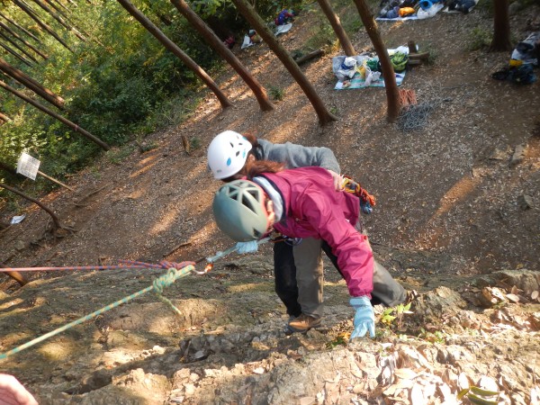 背負い懸垂、介助懸垂を実際に岩場で実施します