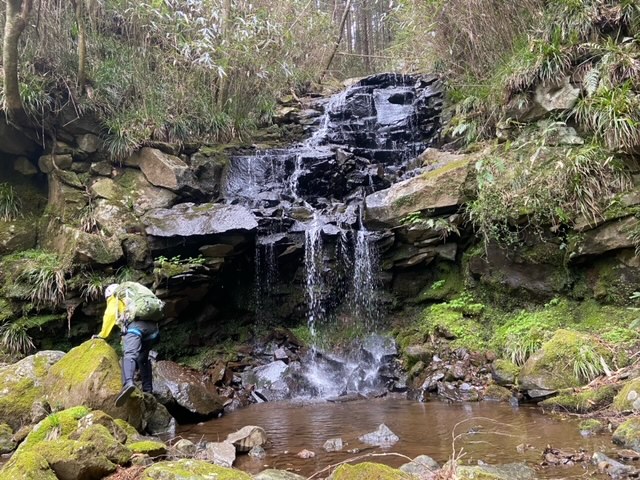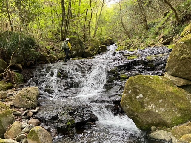 GPSで確認して進路を右へ。その先に現れた大きめの滝は、トポ(『新板 東京起点沢登りルート100』)と合致しないような気がする。不安になって足が早まり、またいくつかの小滝と倒木を乗り越えて、木製の目立つポンプ小屋を見たときにようやく安堵した。どうも前回ツメを間違えたらしい。