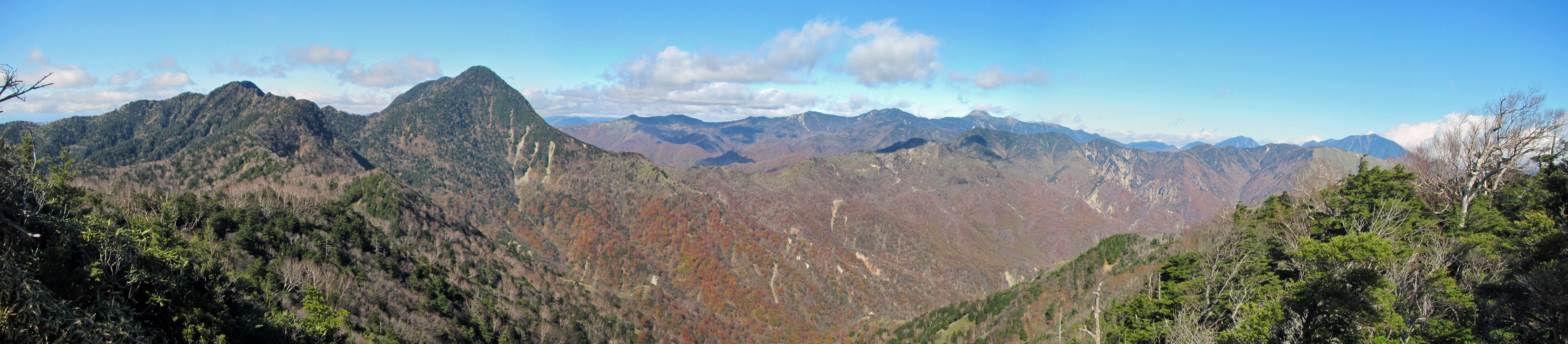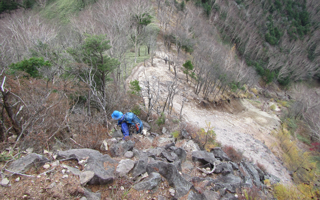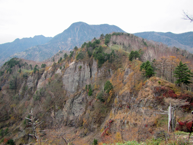 宿堂坊山から緩やかな尾根道を下ってヤジソ平(「水 7分」のプレートあり、水場は未確認)、90m登って1,789m、そこを下りてまた200m登って三俣山(1,980.4m)。長大なルートのアップダウンにいい加減うんざりしてきたところで、次の1,847mピークからコルに下りる箇所が意外な岩稜の急斜面。懸垂下降した方が安全かとも思われたが、慎重にクライムダウンすると樹林に逃げることができ、適度な緊張で気分転換になった。コルから上がった1840m小ピークには「大ナラキの頭」のプレートあり。