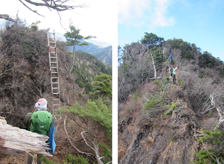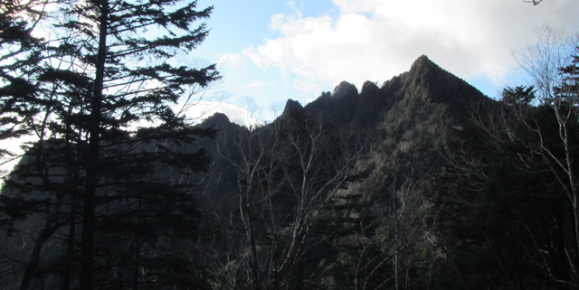 下山路には最後の難関の鋸山が待っている。不動沢のコルまで300m近く下降して見上げる鋸山の稜線はまさしく鋸歯状だ。