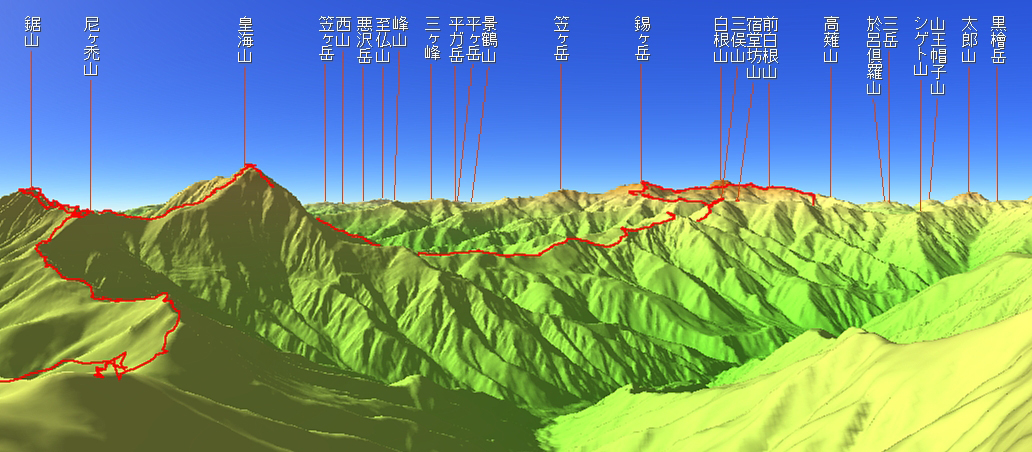 その後は特に困難もなく、渓雲岳(駒掛山手前の1,800m小ピーク。古いエアリアマップには山名が記載されている)から駒掛山(1,808m)を踏み、笹の深いコル(小林英は以前の登りの際にここで行き悩んだ覚えがあるが、今回は容易に踏み跡を辿れた)を渡って、御岳山(尾根上1,840m付近、エアリアに記載あり)を経て庚申山(1,892m)に到着。山頂手前の展望台で、鋸山から皇海山、その背後の今回縦走ルートを再び眺め渡した。