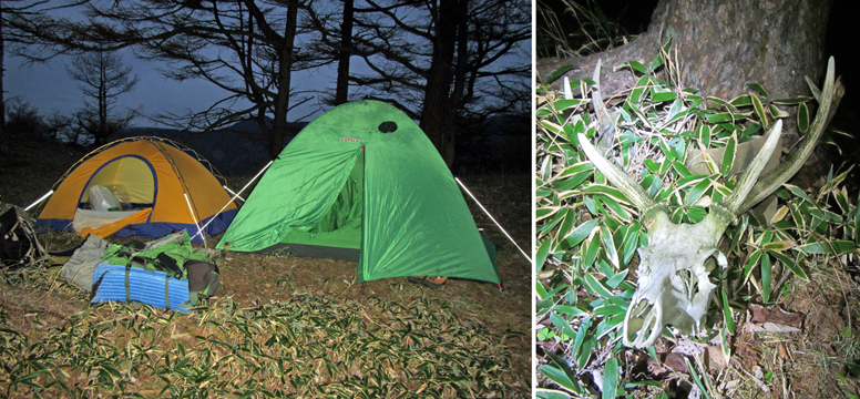 テント設営した傍らに見事な鹿の頭骨があった。水場は50mほども下った沢で、ここまで水切れを心配した反動から大小のプラティパス7個を満たしてテント場に登り返したのが今日の核心。夕餉はスパム入りクリームシチュー。体が温まってとっても美味しかったです。意識を失い就寝。