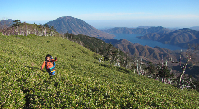前白根山から五色沼避難小屋方面に進み、登山道が小屋に向けて稜線を離れる箇所で通行止めするように置かれている木を乗り越えて直進。ここからバリエーションルートであるが道はしっかりしていて迷うことはない。白根隠山(2,410m)を経由して白桧岳(2,394m)で白錫尾根に乗ると、ここから栃木-群馬の県境を辿ることになる。白桧岳前後で笹が出てきて、膝下くらいの高さになる。2,296mピークとの間などは特に深いが、探せば笹を払って踏み跡があるので苦労はしなかった。シャクナゲもあるが笹が優勢だ。ところどころ木の幹に赤や、赤と黄の目印板が打ちつけてある。左手には中禅寺湖と男体山がきれいだ。適度にアップダウンもあって飽きさせない。
