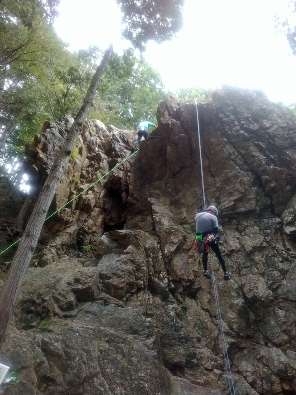 そして女岩へ移動。チムニー(5.6)と、平さんのリクエストでニュー・レフト(5.10a)・左ルート(5.10b)にトップロープを構築し、懸垂下降。チムニー登攀(駿谷)、懸垂下降(穴井)
