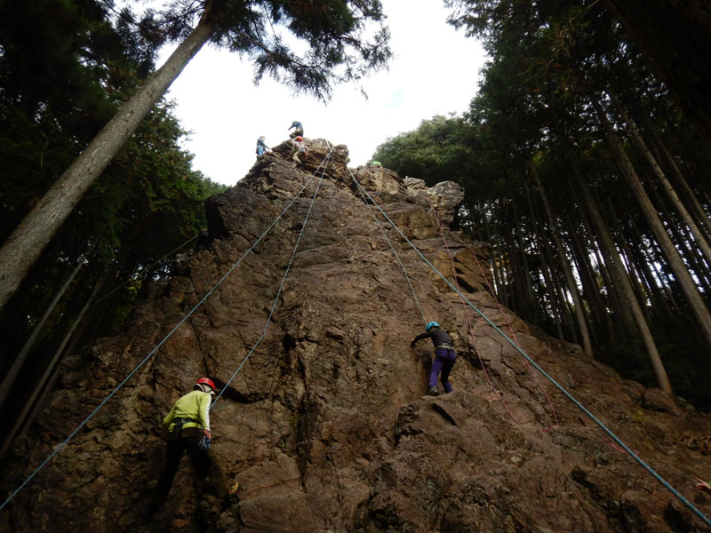 再度登ろうしたが、他の団体が既に取付きで準備を始めている。仕方なく男岩南面最右の5.6ルートを登ることに。しかし、距離は短いものの一部右足のスタンスが乏しく難しい箇所もあり、それなりに楽しむ。上部の樹木にビレイステーションを構築。ここもダブルロープを肩に絡めて懸垂下降。下降後のロープさばきでは、やはりひどい絡まりが生じる。ここもお互いリードとセカンドを1本ずつ、各人2本ずつ登った。体力も気力も未だ残量があり、もう一本登りたい感じだったが時刻は15:30。日も傾き始めているので、本日はここで終了とした。