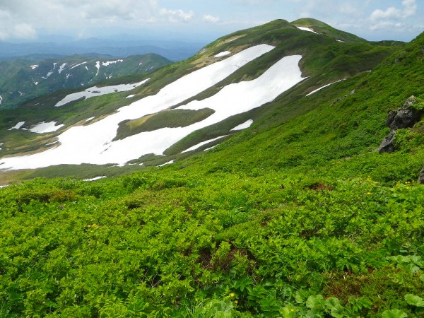 いくつかの雪渓を登ったり・トラバースしたり・・・。今年は、残雪量は多いらしい。台地に登ると、焼石連峰のピーク達に囲まれた、実にのびやかなお花畑となってきた。雪解け水や頂上直下の泉水沼からの沢水などで、頂上台地でさえ水音がトウトウと聞こえ、登山道自体がちょっとした沢になっていたり。決して標高の高い山ではないが、緯度とこの豊富な雪解け水で、この時期に、多彩な高山植物が一斉に花をつけているのでしょう。